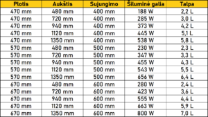 470/480 mm, 470/720 mm, 470/940 mm, 470/1120 mm, 470/1350 mm, 570/480 mm, 570/720 mm, 570/940 mm, 570/1120 mm, 570/1350 mm, 670/1350 mm, 670/940 mm, 670/1120 mm, 670/480 mm, 670/720 mm