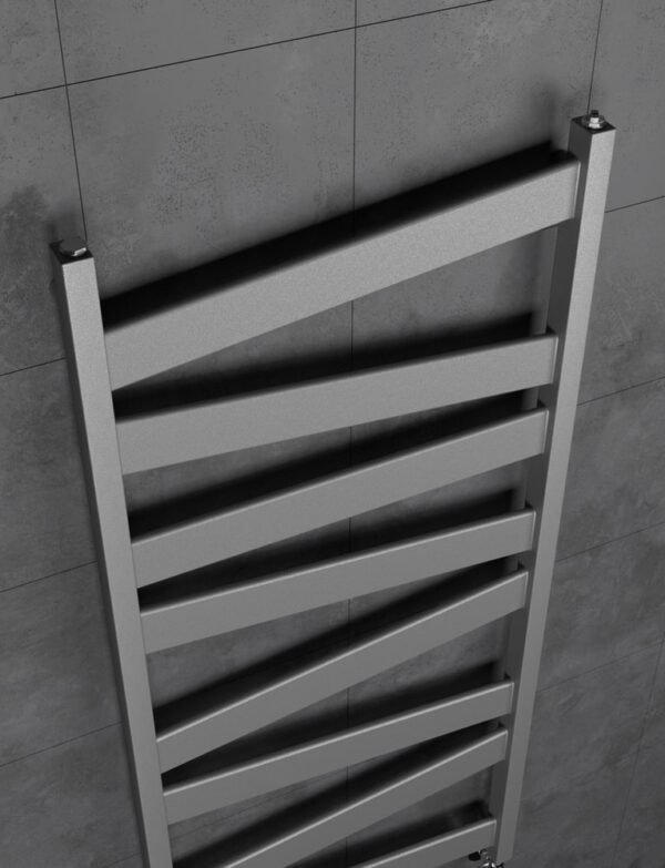 Modernaus dizaino kopėčių radiatorius. Asimetriškai išdėstytos juostelės ir rėmelių trūkumas daro jį itin ekstravagantišku modeliu, kuris taps ryškiu jūsų kambario dekoro elementu.
