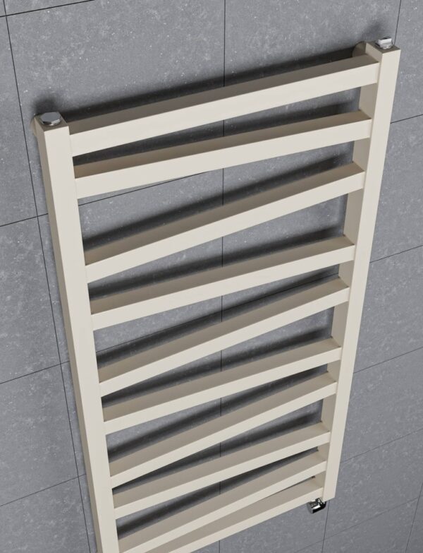 Kopėčių radiatorius su asimetrišku pelekų išdėstymu. Radiatorius idealiai tinka drabužiams ir rankšluosčiams džiovinti. Klasikinis radiatorių dizainas puikiai dera prie vonios kambario dekoro, tačiau asimetriškai suvirinti skersiniai diskretiškai išsiskiria iš kitų dizaino elementų.