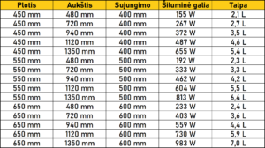 450/480 mm, 450/720 mm, 450/1120 mm, 450/940 mm, 450/1350 mm, 550/720 mm, 550/940 mm, 550/1120 mm, 550/1350 mm, 550/480 mm, 650/940 mm, 650/480 mm, 650/720 mm, 650/1120 mm, 650/1350 mm