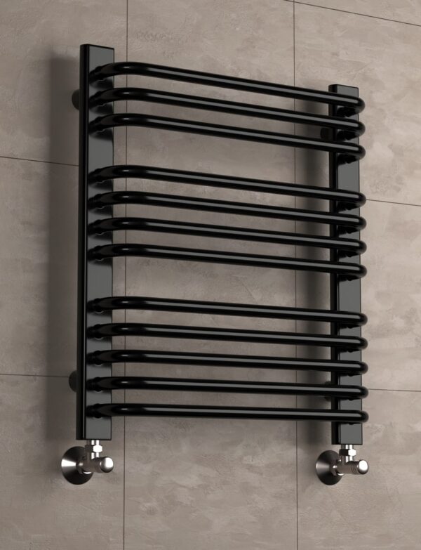 Vonios radiatorius su kopėčių dizainu. Paprastas, bet akį traukiantis dizainas puikiai dera ispaniško stiliaus vonios kambaryje.